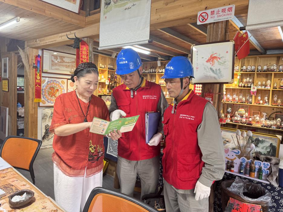 在“蛋画”体验基地,巡检人员仔细检查了屋内各个角落的开关、插座以及线路等用电设施,针对发现的问题,及时提出整改意见和建议。他们还向相关负责人、商户分发“安全用电小常识”“为什么要节约用电”等宣传折页,并逐一讲解电力相关知识。