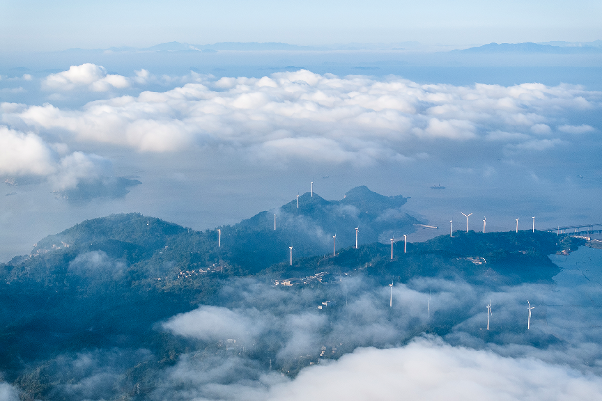 一排排风力发电机矗立在浙江温州洞头蔚蓝的海岸线上。国网温州市洞头区供电公司供图