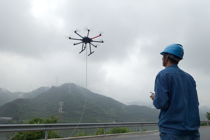 “此次跨江线路牵引采用了无人机技术,极大地提高了工作效率。以往依靠船只渡江牵引需耗时约一小时的工作,现在使用无人机仅需十几分钟即可完成。同时,我们也感谢建德市海事部门的大力支持,他们于9月23日上午8点30分至25日10点30分期间对江面进行了封航,确保了架线工作的顺利开展。”梅城项目部负责人介绍。