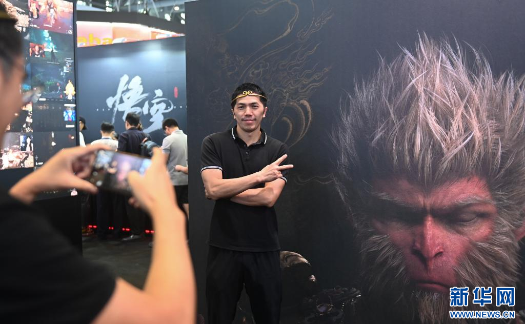 9月25日,在浙江杭州举办的第三届全球数字贸易博览会上,观众在国内首款3A游戏《黑神话:悟空》展区打卡留念。新华社记者黄宗治 摄