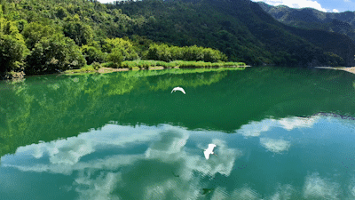 鸟儿在江面上飞舞盘旋。