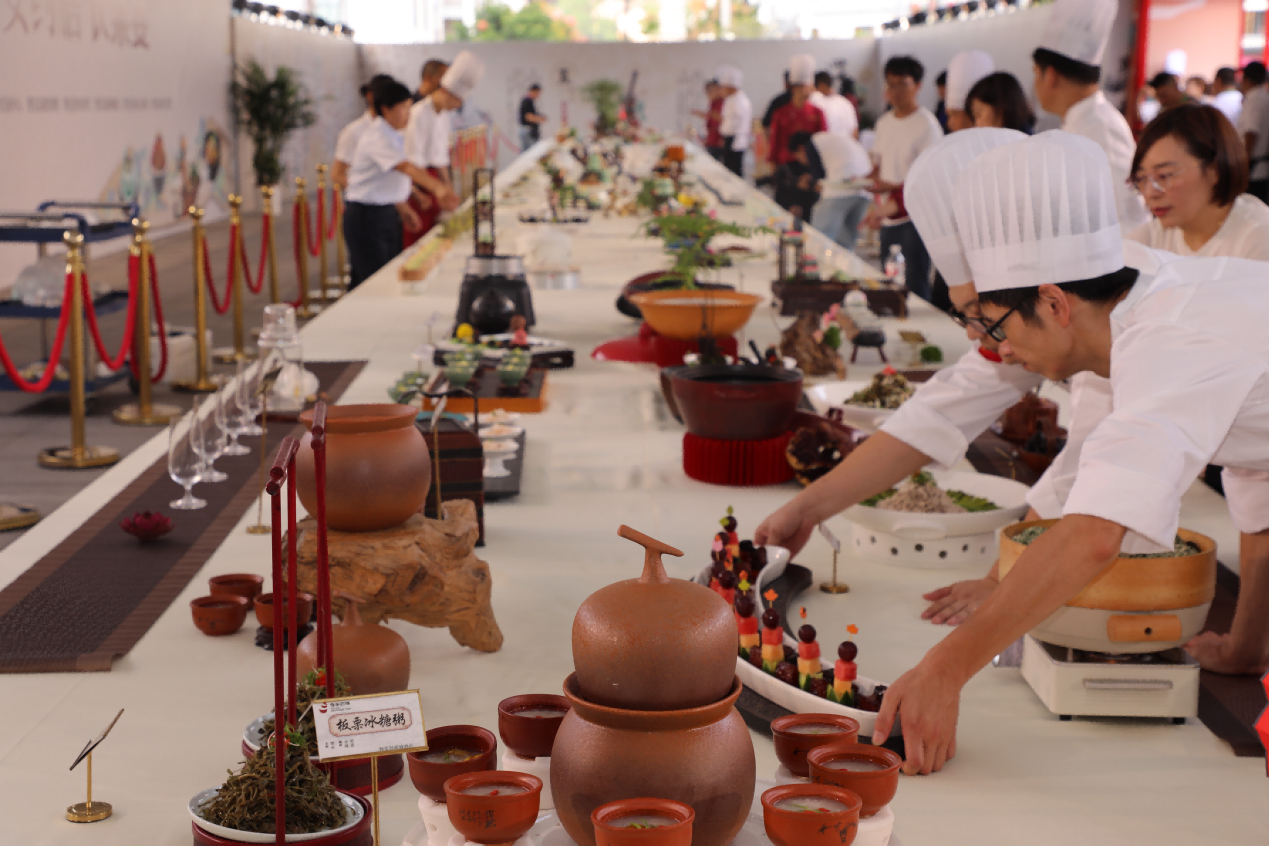 羊蹄甲鱼冻、黄精蒸大鹅、天麻焗土鸡……在磐安药膳长桌宴上,一道道造型精美、色香味俱全的药膳,在大厨娴熟的技艺中纷纷亮相,在江南药镇养生博览馆广场的长桌上一字排开,八方来客举杯共饮,百余道药膳同享盛宴。