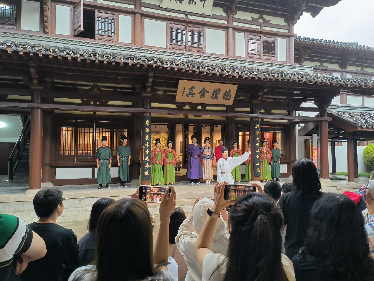 在古城新晋的唐风打卡地贺秘监祠,根据贺知章《回乡偶书》改编的综合性实景演出《笑问客从何处来》如约与市民游客见面。首日两场演出,座无虚席。“贺知章作为绍兴名人IP之一,传达的是大度乐观的人像形象,与节日氛围极度融洽,一首《回乡偶书》广为人知,具备广泛群众基础,通过近40分钟的实景演出,融合情景剧、传统曲艺、通俗歌曲、现代舞蹈等多样形式,在轻松愉悦的场景中,向游客介绍浙东唐诗之路上贺知章与李白金龟换酒的故事。”国家一级编剧导演钱勇作为《笑问客从何处来》总导演,他介绍,在演出的过程中,游客可以实时进行沉浸式“角色扮演”。
