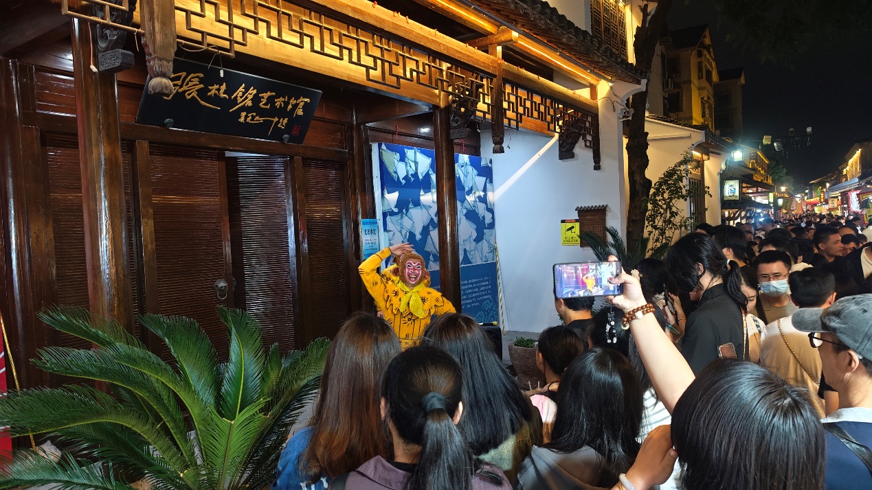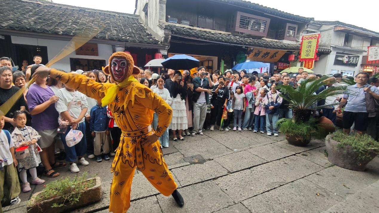 与黑神话“悟空”巡街交相辉映的是散布在城市多个广场街区的“猴哥”。国庆假期,绍剧艺术研究院携发源于绍兴的“绍剧猴戏”上街,所呈现的艺术风格不但有江南风土的清丽委婉,更有乱弹声腔的古朴豪迈。他们在孑民广场、仓桥直街、城市广场等地,吸引市民游客和“猴哥”一起快闪,在流动的环境中讲述着戏曲之乡的独特魅力。