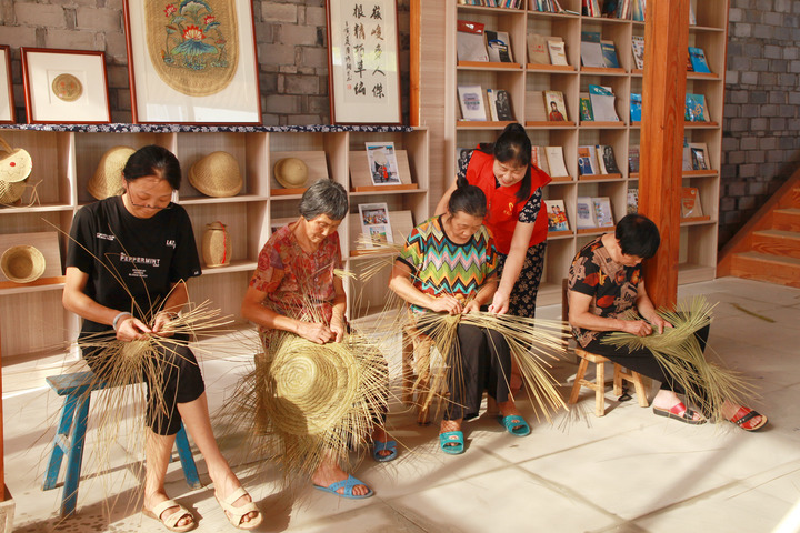 在浙江临海市东塍镇岭根村共富工坊内,村民正在制作草编工艺品。(梁蕙薇 摄)