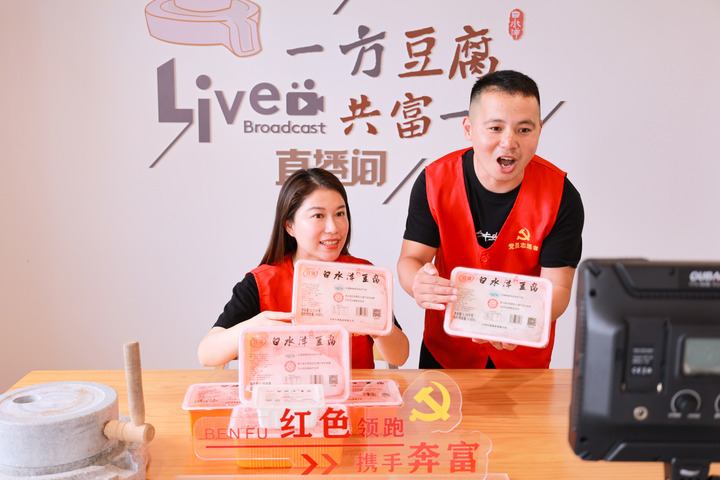 “帮农客“团队帮助浙江临海白水洋豆腐共富工坊直播销售产品。(冯礼欣 摄)