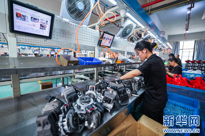 2024年8月14日,在位于金华市的浙江托马斯工具制造有限公司数字化车间内,工人在流水线上生产出口的园林机械。新华社记者 徐昱 摄