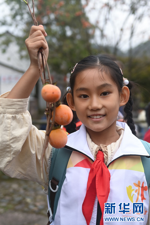 10月20日,在大岚镇柿林村参加青少年研学活动的小学生展示采摘的柿子。