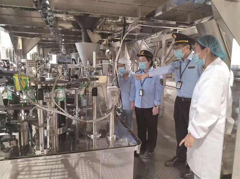 余姚市市场监管局执法人员在榨菜自动化包装车间检查。