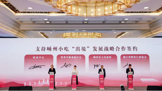 随后,世界中餐业联合会、欧亚中心、浙江省餐饮行业协会等多家权威机构与嵊州市也相继签约,共同支持嵊州小吃“出境”发展。