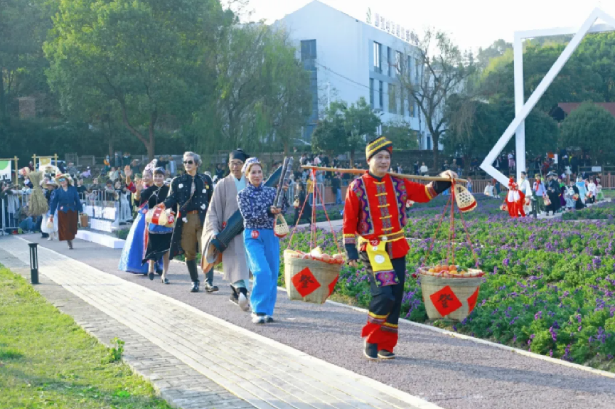 活动开场,来自各行各业的立春鼓社的社员们身着本职业的工服,为大家送上暖场表演。随后,荆溪村书记徐炎六骑着“二八大杠”自行车,载着大喇叭缓缓入场。伴随着大喇叭里的通知声,走秀活动正式开始。