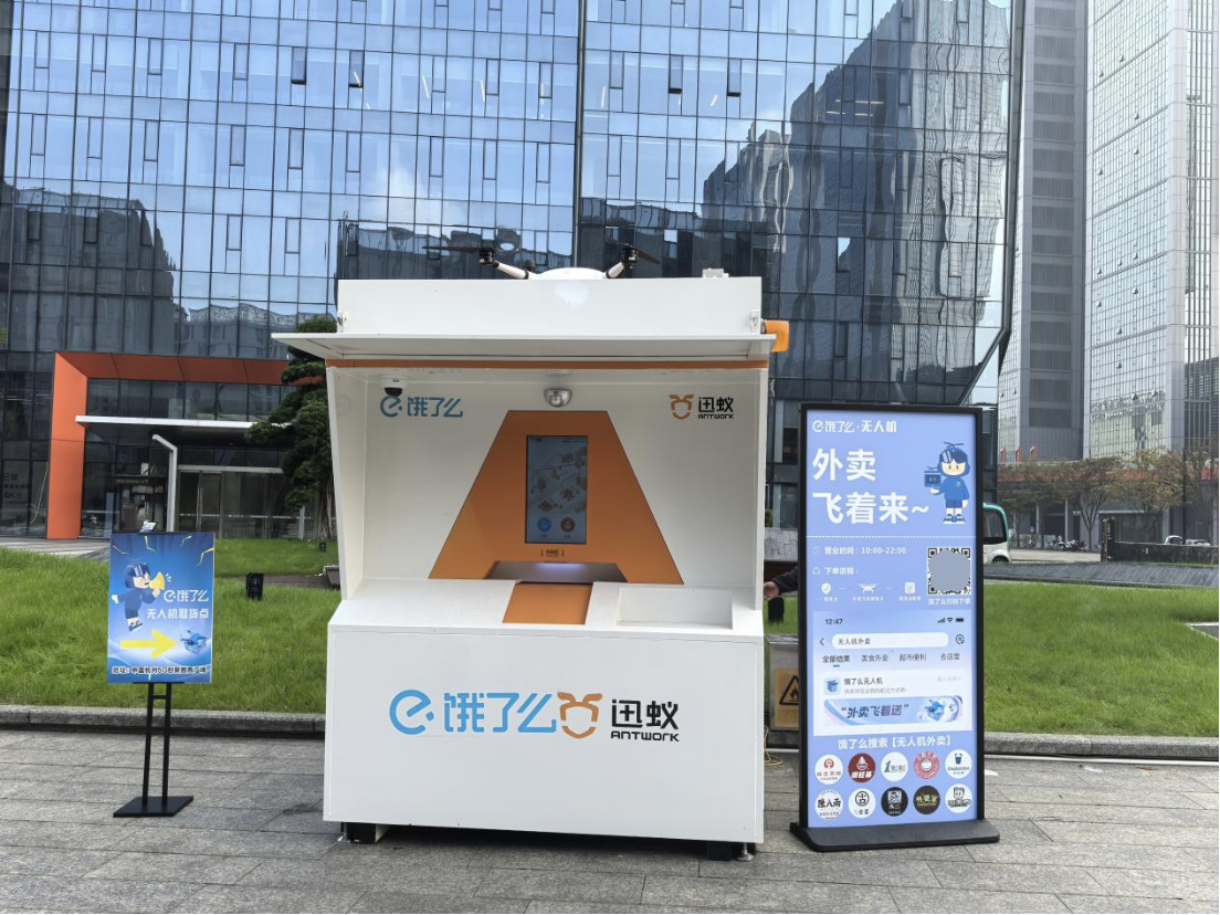 企业园区的用户可以打开外卖APP,找到无人机外卖入口,选择美瑭广场或万达广场的店铺,下单后等待配送。无人机将外卖送到园区接收终端后会向下单人发出提醒,下单人像使用外卖柜一样,在机器上扫码取餐即可。通过无人机送餐,有效解决了园区管理与外卖配送之间的矛盾,在点餐高峰期不受堵车、雨天等因素影响,配送时效性也更有保证。