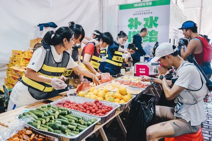 赛前一个月,赛事志愿者就开始背着近5000斤的纯净水、能量棒等赛事物资,徒步近7.5公里,攀爬800多米,在车辆无法通行且无水、无电、无通讯信号的“道场基”点位搭建起可供4500人使用的赛事服务点。这一背,民间还诞生了一个“背水节”。