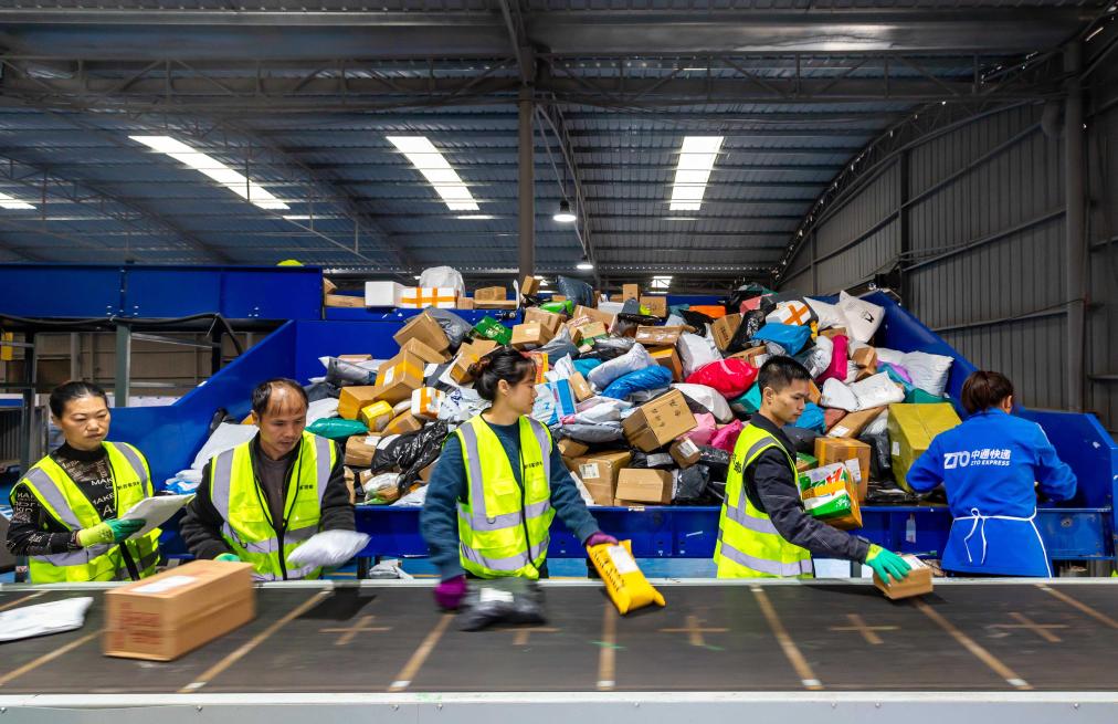 11月11日,工作人员在贵州省黔西市双桥客运站快递物流中心分拣快递。新华社发(范晖 摄)
