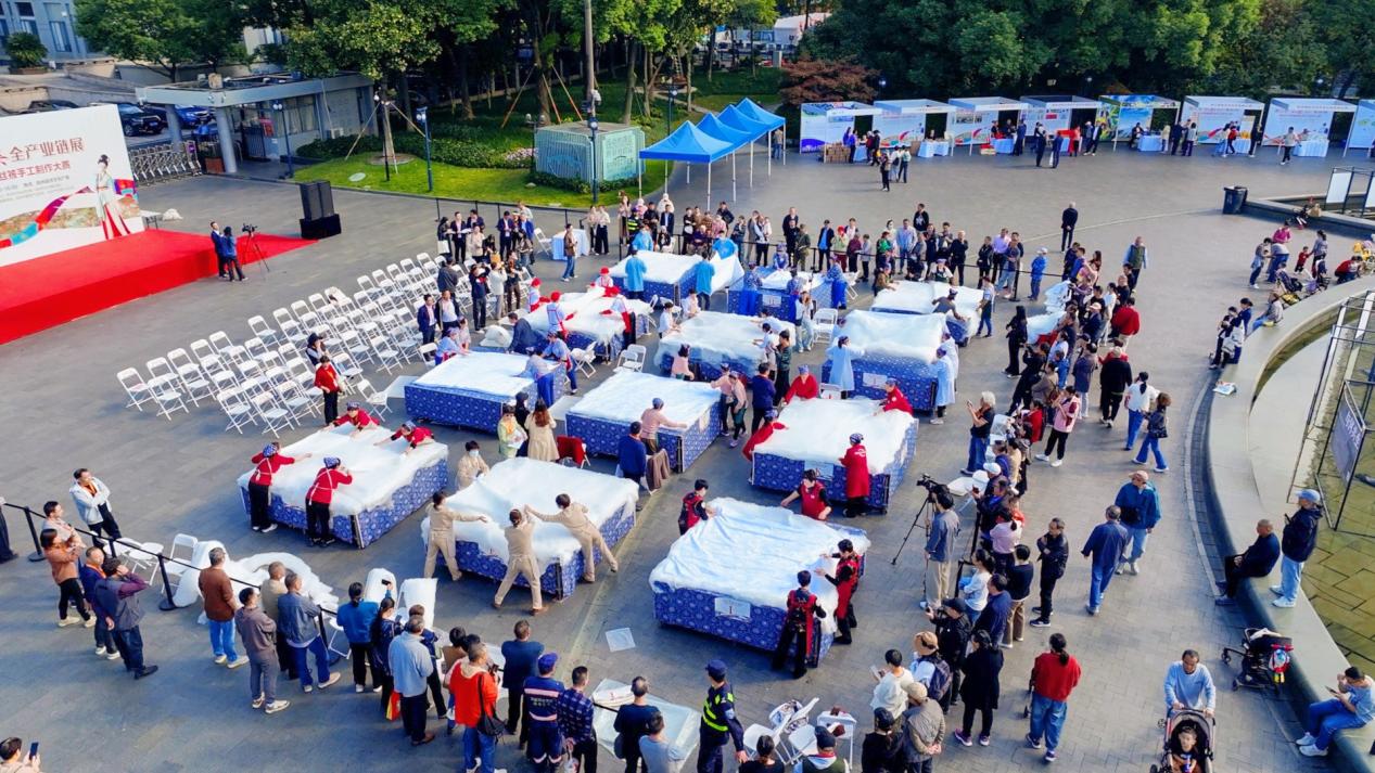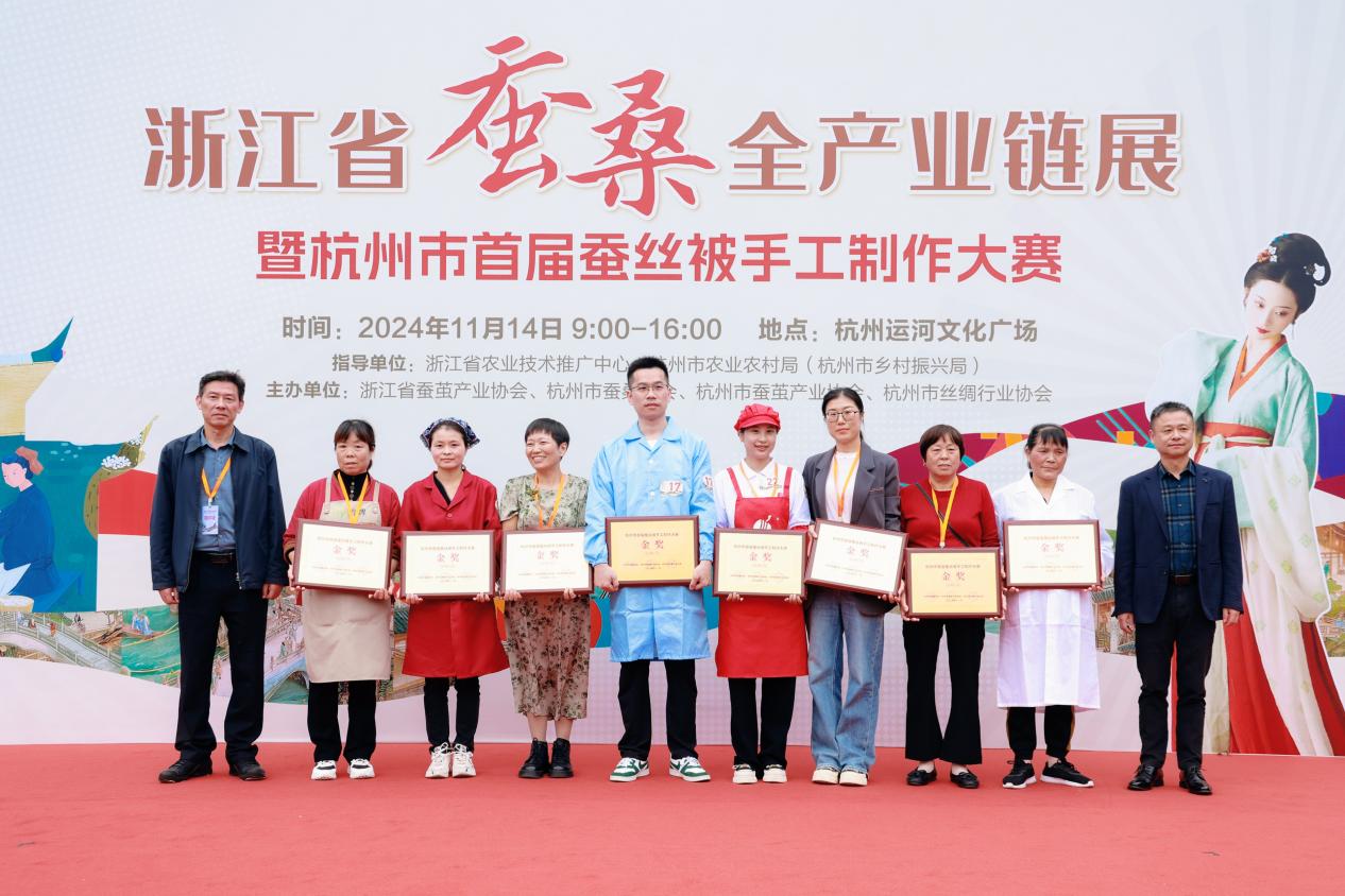 近日,浙江省蚕桑全产业链展暨杭州市首届蚕丝被手工制作大赛在杭州举行。