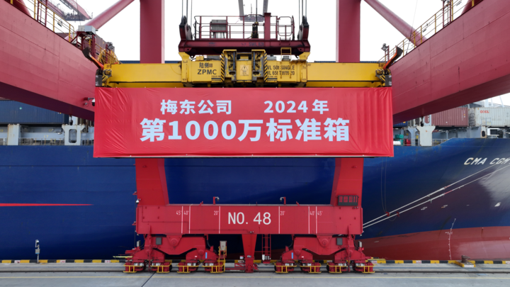 图为宁波舟山港梅山港区今年第1000万标准箱起吊。(宁波舟山港供图)