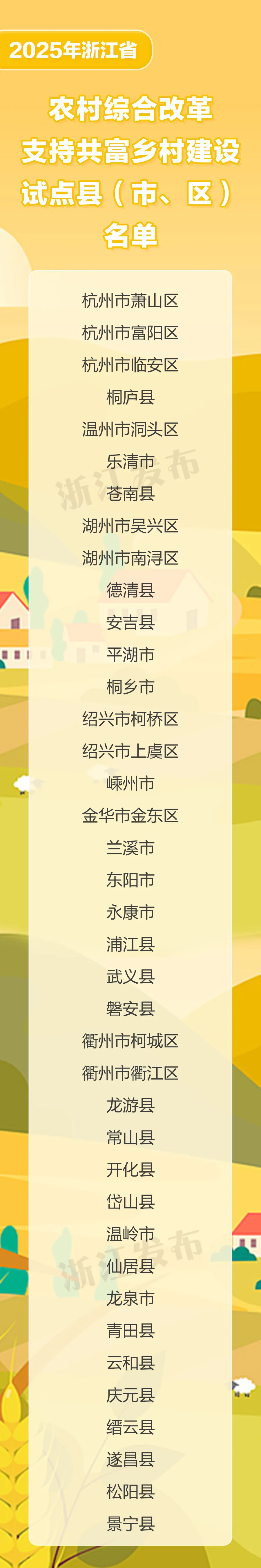 经县级申报、省级评审、名单公示等系列程序,浙江省财政厅近日发布通知,同意39个县(市、区)列入2025年度农村综合改革支持共富乡村建设试点范围。