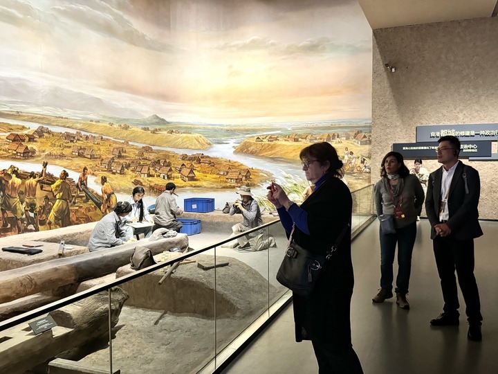 11月25日,在位于浙江杭州的良渚博物院,国际考古学者在展厅中感受良渚遗址的考古成果及其价值。新华社记者 郑可意 摄