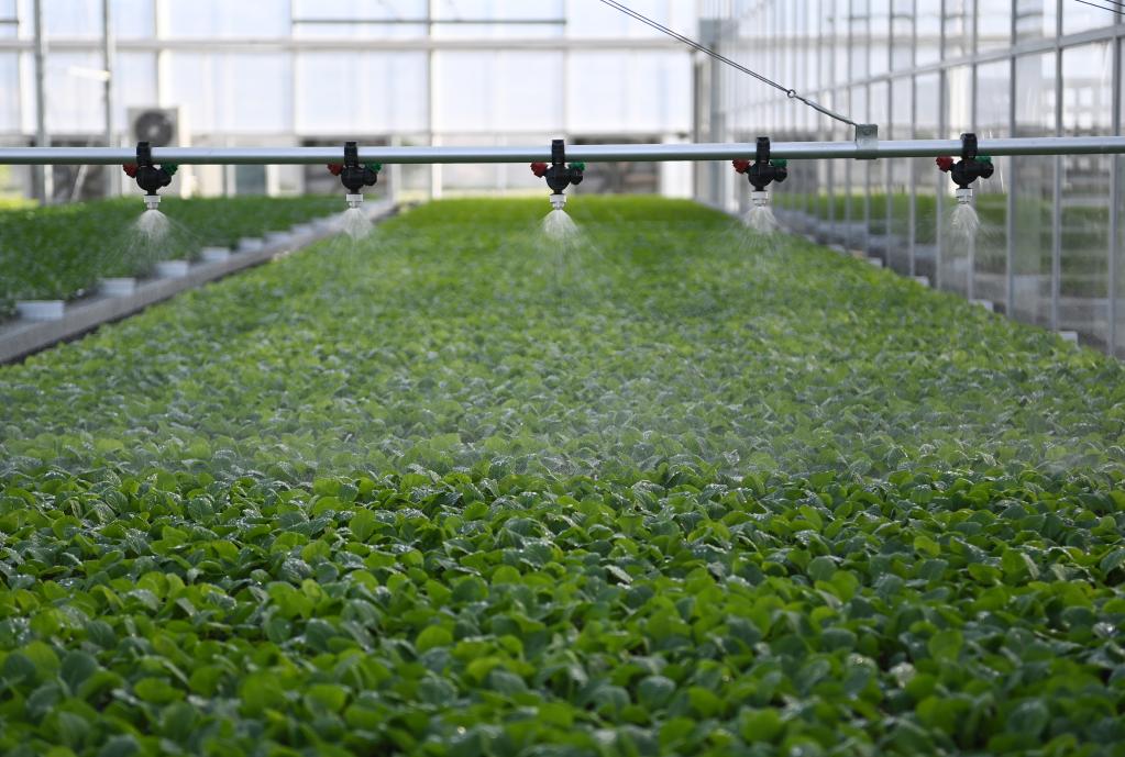 12月2日,在谢径安·传化农创村植物科学中心里,自动喷灌系统在数字种苗工厂内灌溉育苗。新华社记者 卢哲 摄