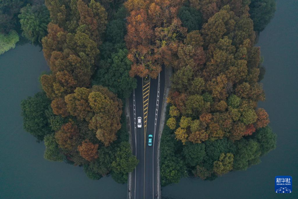 12月3日,汽车行驶在杭州西湖景区的杨公堤(无人机照片)。