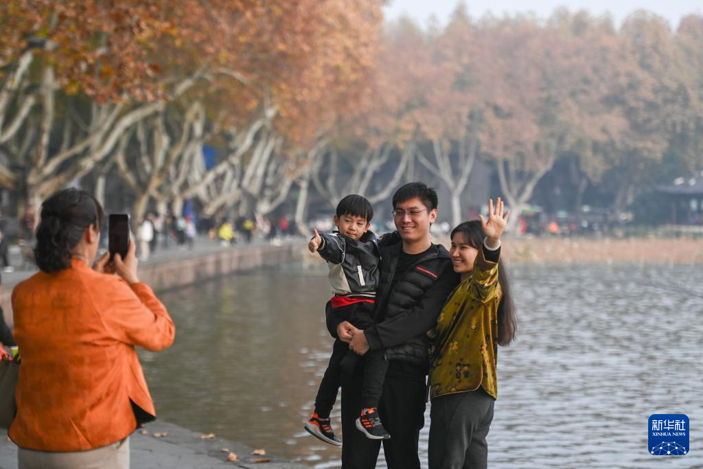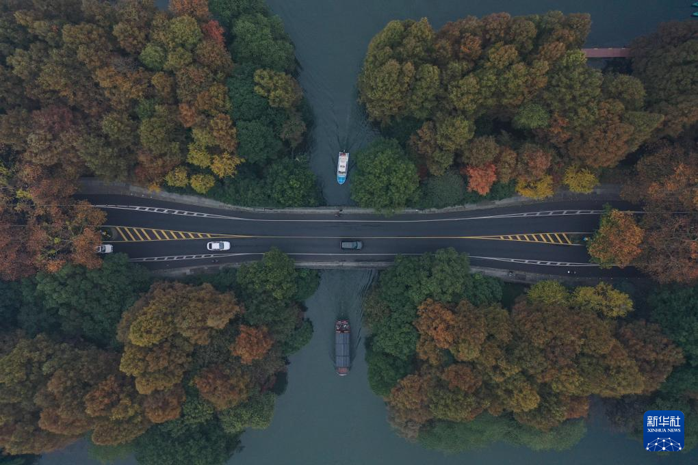 12月3日,汽车行驶在杭州西湖景区的杨公堤,游船从桥下穿过(无人机照片)。