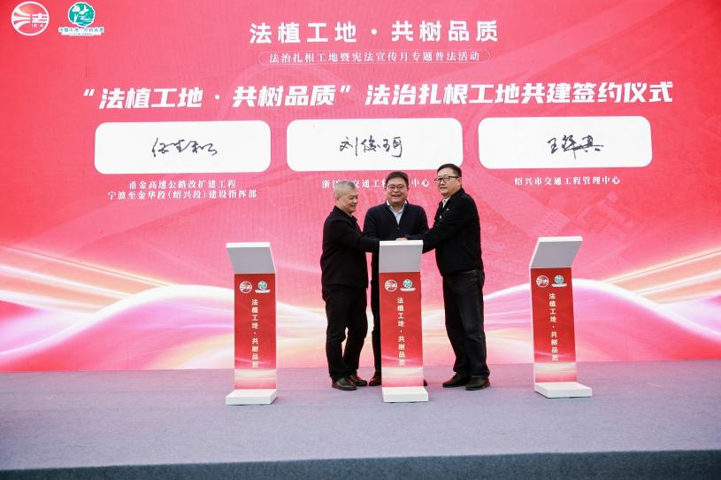 活动现场,浙江省交通工程管理中心、绍兴市交通工程管理中心和甬金高速公路改扩建工程宁波至金华段(绍兴段)建设指挥部签订法治共建协议,并被授予“‘法植工地 共树品质’法治扎根工地”共建单位牌匾。省、市、项目三方将依托共建协议,协同并进,共同提高项目建设管理水平,推动交通工程建设领域治理体系和治理能力现代化,为交通建设行业高质量发展保驾护航。