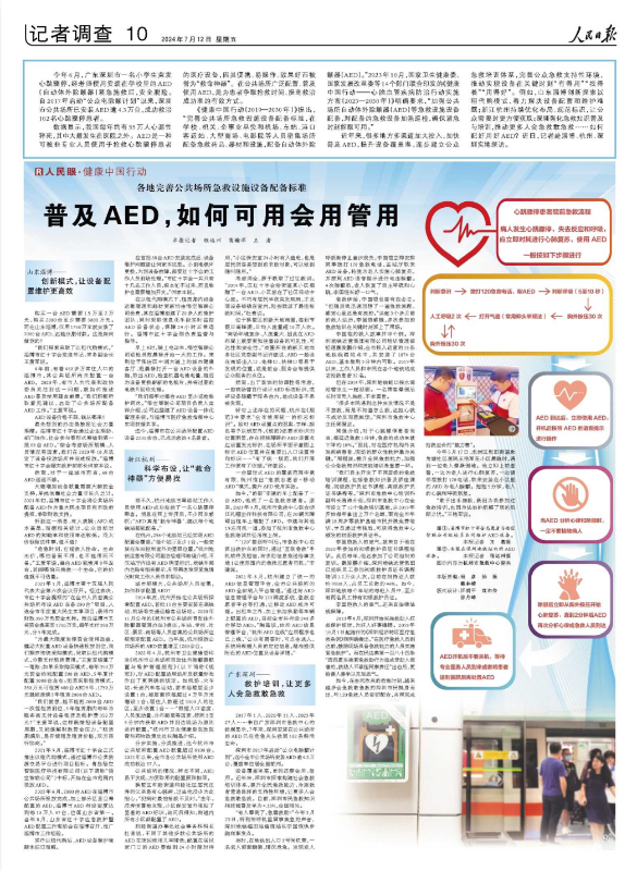 近年来,很多地方多渠道加大投入,加快普及AED,提升设备覆盖率,逐步建立公众急救培训体系,完善公众急救支持性环境,推动实现设备在关键时刻“有得用”“找得着”“用得好”。例如,山东淄博创新探索以租代购模式,着力解决设备配置和维护难题;浙江杭州持续优化布局、规范标识,让公众需要时更方便获取;深圳强化急救知识普及与培训,推动更多人会急救敢急救……如何配好用好AED?近日,记者赴淄博、杭州、深圳实地探访。