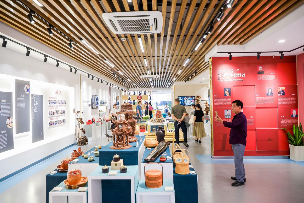 “天目匠心馆”是浙江省首个集工运历史、匠人培训、直播带货、特色产品展示等多功能于一体的综合性基地,也是弘扬“三个精神”、工会宣教新高地。走进场馆,昌化石雕、青柯鸟笼、天目漆器、湍口布鞋……展品琳琅满目,既是观赏品,还是联络媒介。参观者如果心仪,可直接扫码购买或定制。