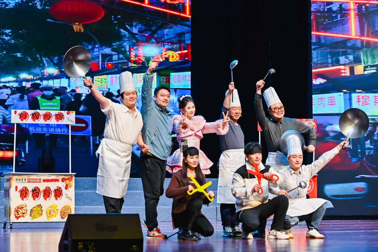 平日里,他们是影视剧里客串小角色的“横漂”;舞台上,他们是拥有巧思妙想的创作者。情景剧《新业态 动起来》由东阳市横漂工会原创,以当地发展振兴路夜经济消费新业态为背景,讲述了网络主播、厨师、理发师等不同职业人群现场参加“趣味运动会”的故事,诠释着新时代劳动者的别样风采。“为了让情景剧更加贴近生活,我们还特地组织演员们去振兴路夜市体验了一把,感受新业态的蓬勃活力。”《新业态 动起来》导演于洋说。
