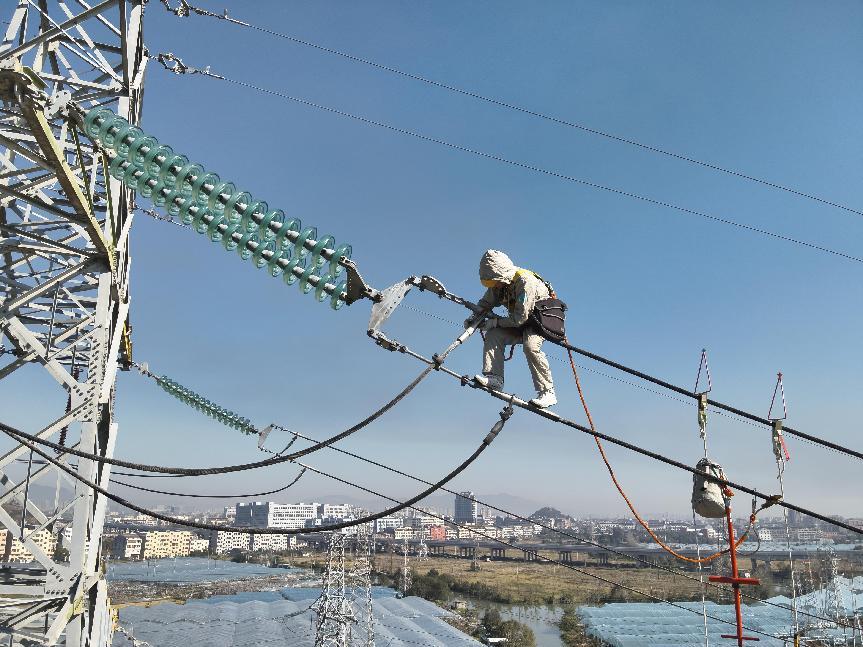 国网温州供电公司输电运检中心检修人员采用“无人机+小飞侠”工作法对220千伏山嘉线开展等电位带电作业。章林炜 摄