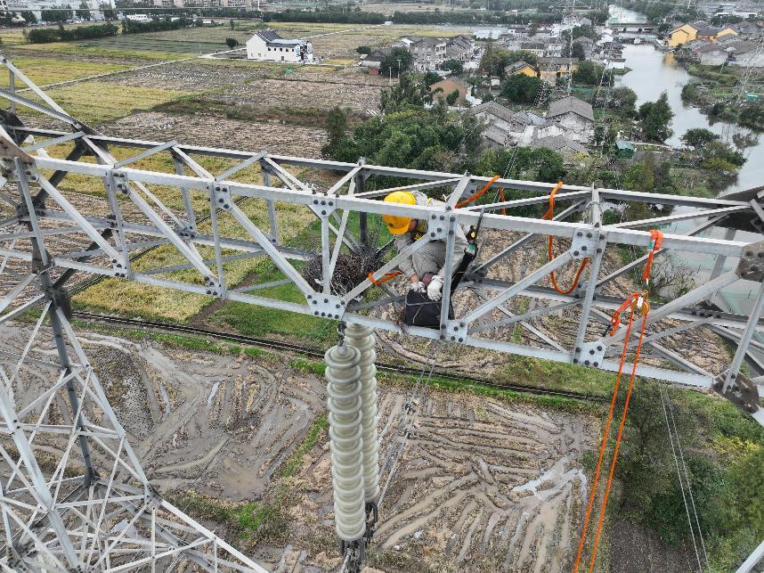 国网温州供电公司输电运检中心对220千伏雁山线开展带电清除鸟窝工作。谈欢欢 摄