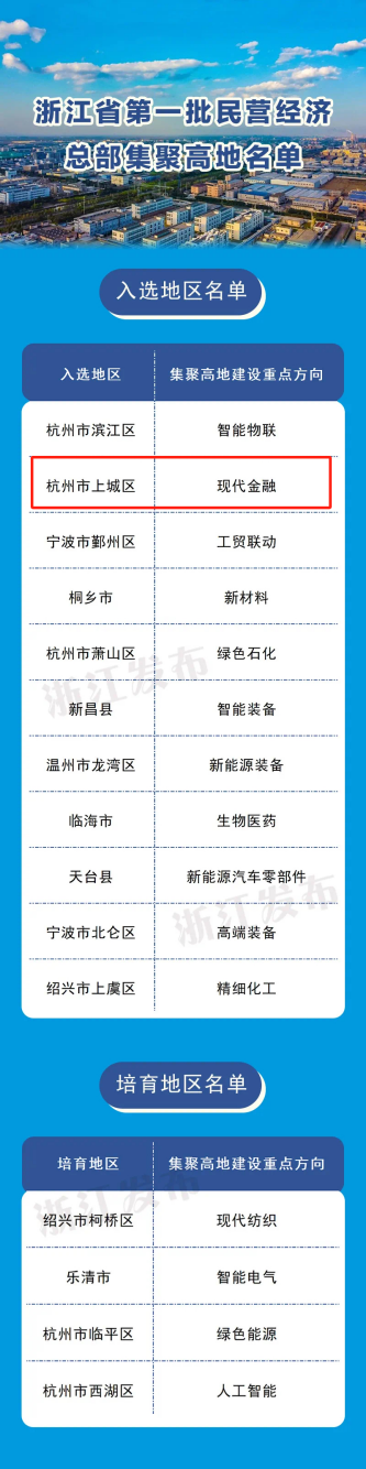 近日,浙江省经信厅公布浙江省第一批民营经济总部集聚高地名单,全省11个县(市、区)入选,杭州市上城区以“现代金融”为建设重点方向的民营经济总部集聚高地上榜。