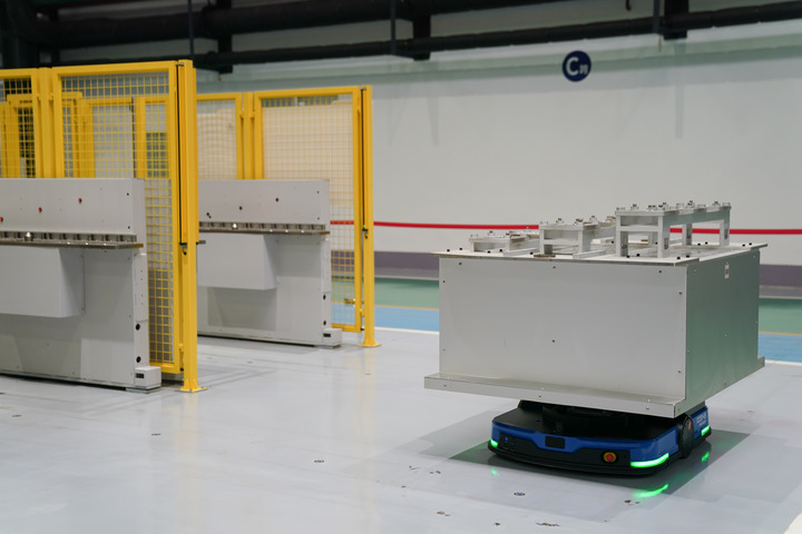 AGV小车搭载叶片部件行驶在东方汽轮机有限公司的叶片加工无人车间。新华社记者 胥冰洁 摄