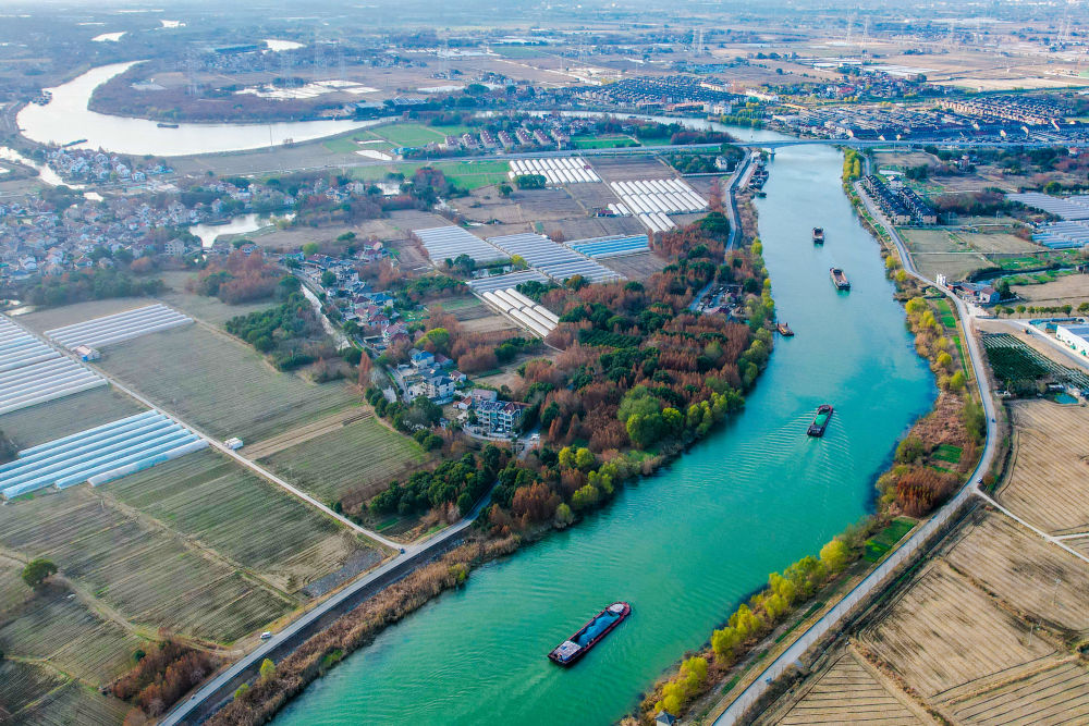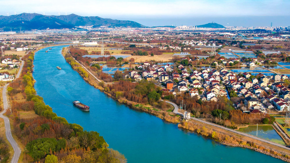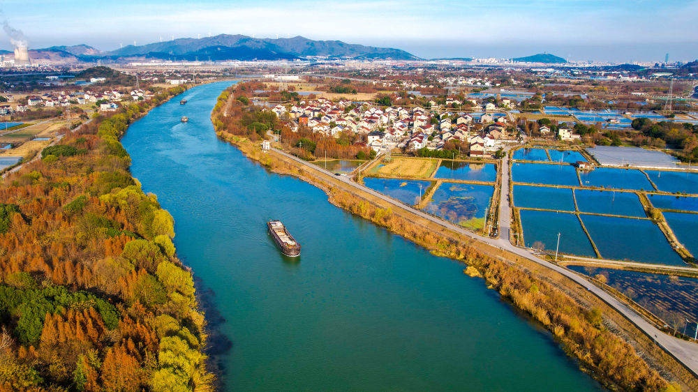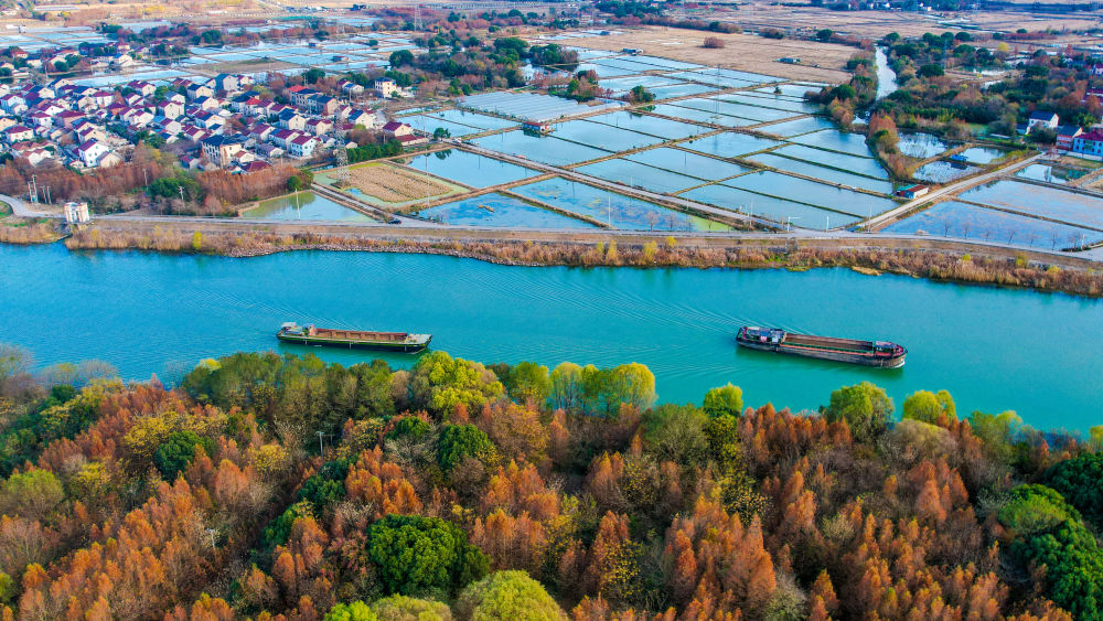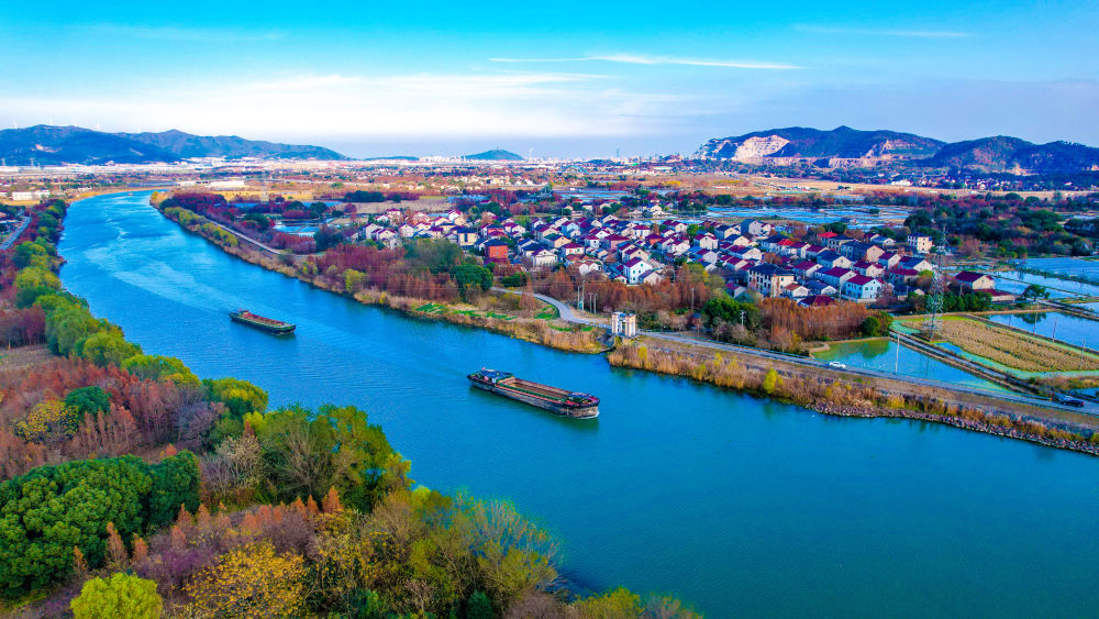 冬日时节,位于浙江省湖州市长兴县的长湖申线航道长兴和平段披上绚丽的冬日盛装,两岸层林尽染,美不胜收。一艘艘装满物资的货船有序航行,呈现出一派繁忙景象。