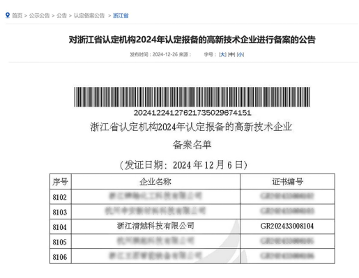 近日,浙江清越科技有限公司(简称:清越科技)通过“2024年度国家高新技术企业”认定。