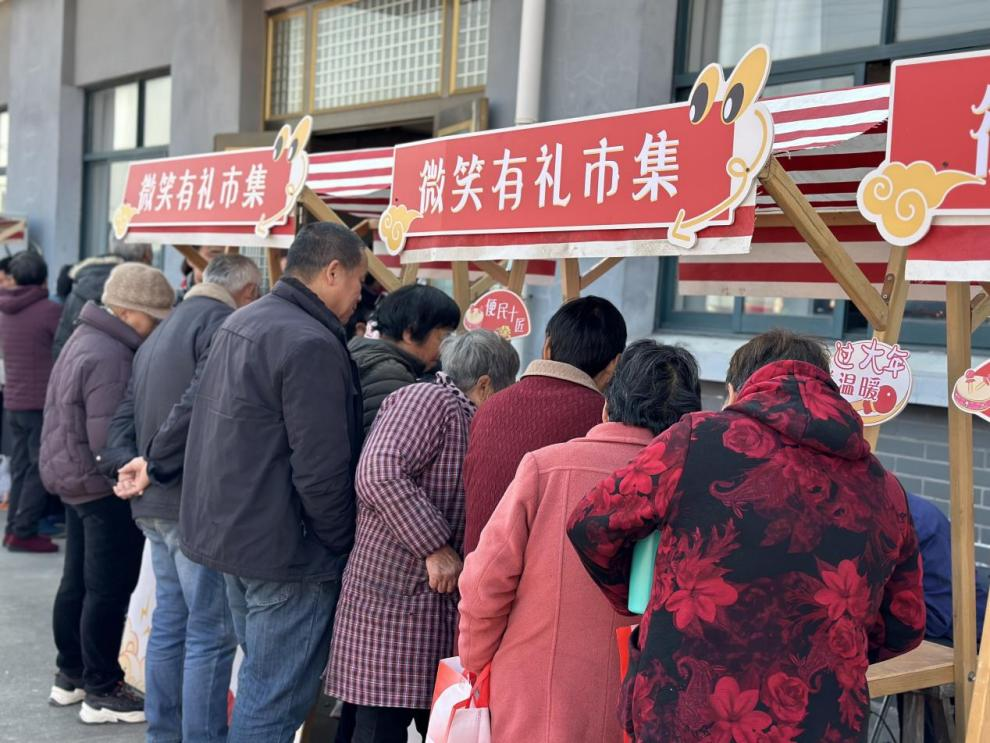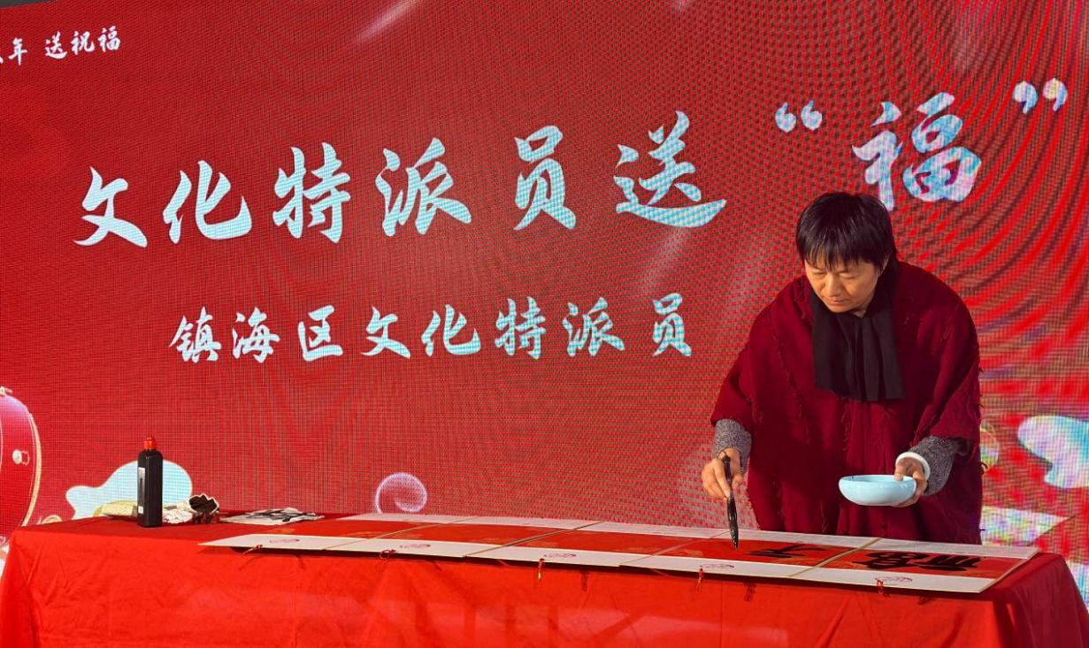共富展示区、年货寻味区、文明有礼区等不同主题区的近30家摊位在礼堂广场一字排开。宁波米糕、宁波丰糕等非遗美食,公益理发、中医理疗、垃圾分类等“便民十匠”服务,面塑技艺、牡丹国画等传统文化,吸引众多村民驻足。其中,人气最高的要属区级文化特派员王荆现场送“福”。红纸铺开、挥毫泼墨,一幅幅喜庆的春联随笔尖流动而出,一个个红火的“福”字跃然纸上。她还根据村民的需求现场写祝福,一笔一划都蕴含着美好的祝愿。