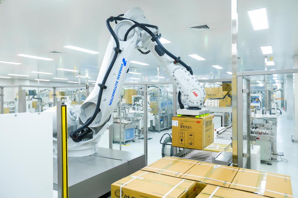 江中药谷片剂车间,机械臂正在进行码垛作业。(受访者供图)