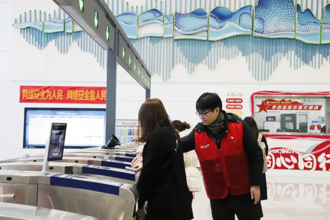 浙江交通集团幸福轨道公司党委组织开展“情满旅途 暖冬行动”主题党日活动。春运首日,在温州S1线各个站点,党员志愿者耐心地为乘客提供乘车指引、购票指导以及进闸引导等服务,主动帮助携带大件行李的乘客,照顾老弱病残孕等特殊群体,解答乘客的每一个疑问,用实际行动传递温暖与正能量。(林夕榆 李卓凝 叶梅/文 浙江交通集团幸福轨道公司/供图)