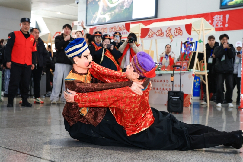 随着锣鼓一对木偶登台,你推我让,左翻右滚,精彩的表演将观众带入其中,感受木偶摔跤的魅力。“我们向来往的旅客们展现余姚非遗文化,让大家感受‘第二故乡’的文化,为大家回乡路增添乐趣。”文艺志愿者、宁波木偶摔跤非物质文化遗产传承人钱百君说。