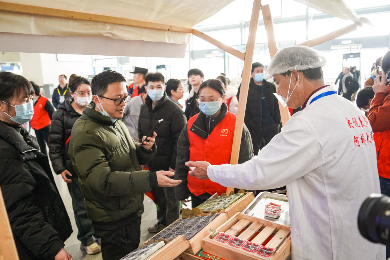看演出,品美食。活动现场,除了文艺展演还设有非遗展陈区、美食体验站、“相片留温情 温暖回家路”摄影服务站以及“年年有‘余’,‘姚’您吃面”等活动,不仅有独具余姚特色的非遗美食赠送,还有春联“福”字领取、余姚剪纸作品展示、免费摄影留念等,展现了余姚特色文化与年味,为每一位踏上归途的旅客送上这份来自“第二故乡”的温暖。