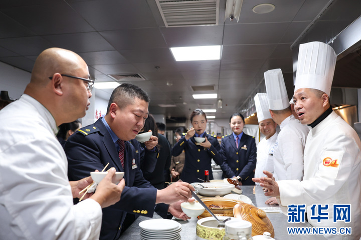 2024年12月29日,铁路杭州客运段餐车炊事员(左一)在杭州望湖宾馆与宾馆厨师团队交流菜品制作技艺。