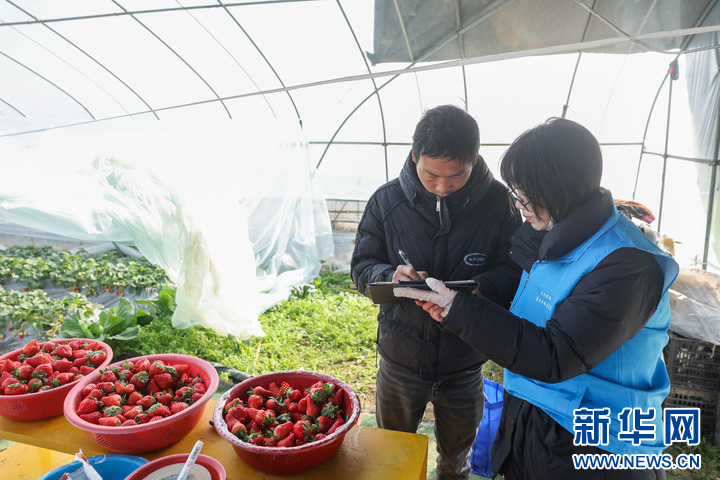 1月15日,在道场乡红里山村的草莓种植大棚内,种植户(左)签字确认抽检的草莓批次。