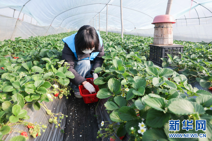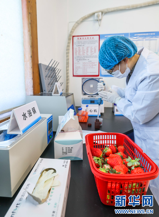 1月15日,在道场乡红里山村的草莓种植大棚内,工作人员在采样准备进行农残检测。