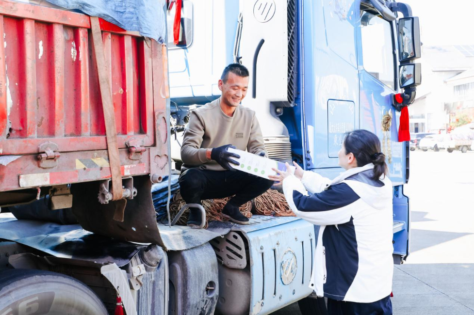 哈尔斯工作人员为卡车司机赠送保温杯。王伟杰 摄