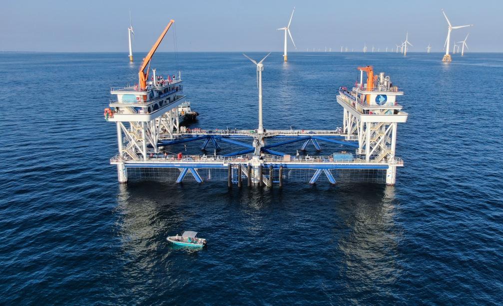 这是2024年9月2日拍摄的中广核“伏羲一号”风渔融合网箱平台(无人机照片)。9月4日,超大型风渔融合网箱平台——中广核“伏羲一号”正式在广东汕尾建成投运。新华社记者 邓华 摄