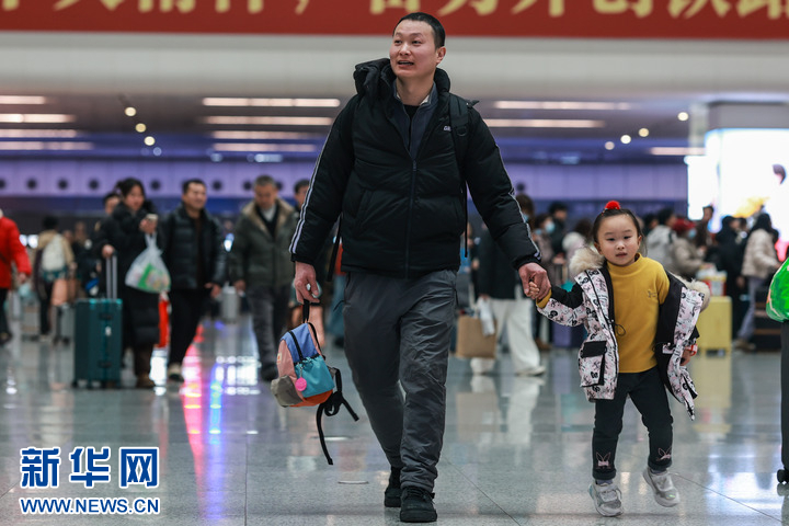 1月24日,旅客带着孩子行走在杭州东站候车室内。新华社记者 江汉 摄