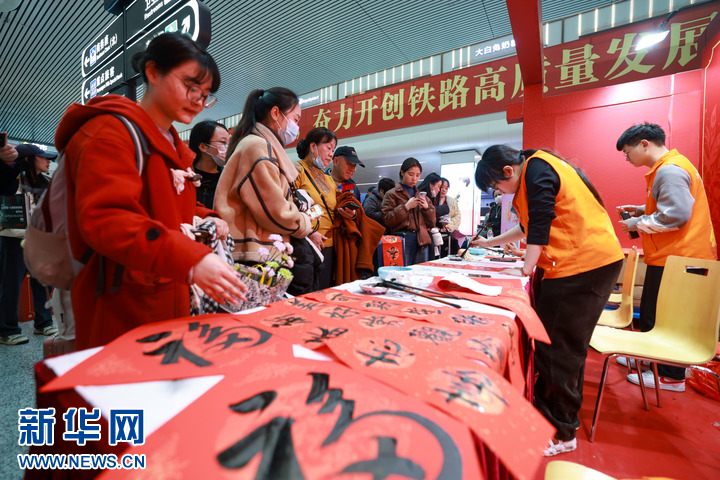 1月24日,旅客在杭州东站候车室内设立的志愿服务区领取福字与春联。新华社记者 江汉 摄