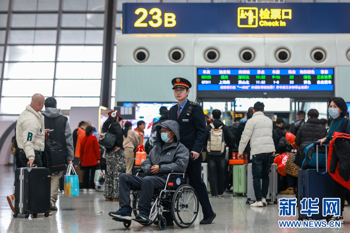 1月24日,杭州东站铁路工作人员为重点旅客提供出行服务。新华社记者 江汉 摄