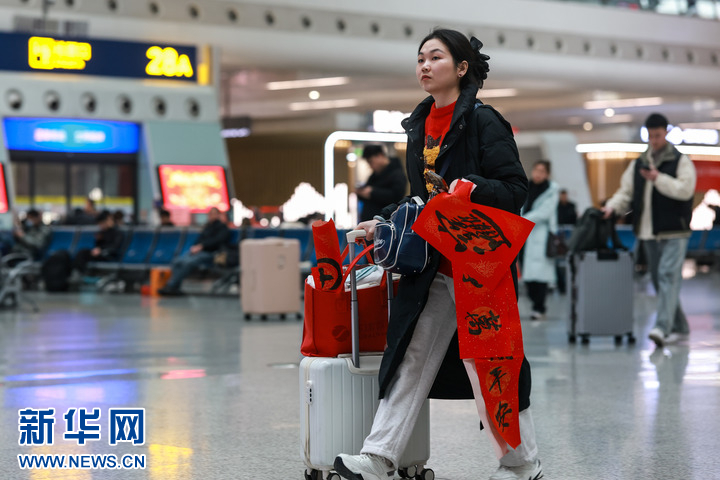 1月24日,拿着春联的旅客行走在杭州东站候车室内。新华社记者 江汉 摄