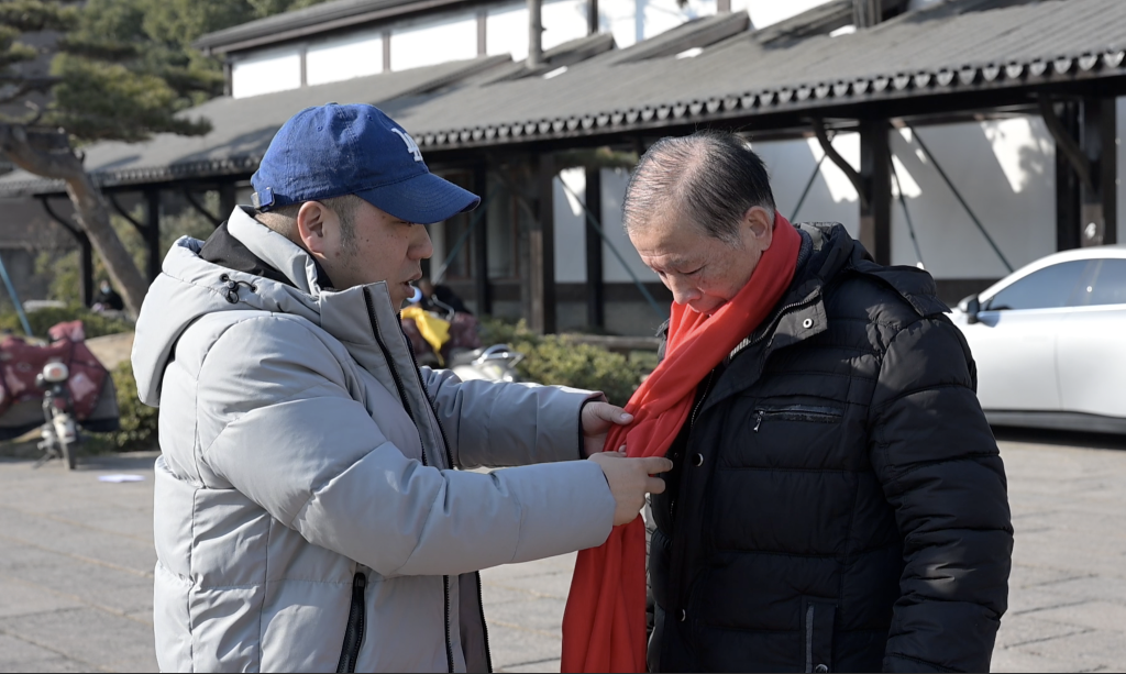 “您今天穿的衣服全是深色的,画面里看起来有点暗,我来想想办法。”石战杰思索片刻,解下了自己脖子上的红围巾,李立给72岁的村民袁阿良系上。加上一抹亮色,照片瞬间变得喜庆起来,袁阿良笑得合不拢嘴。